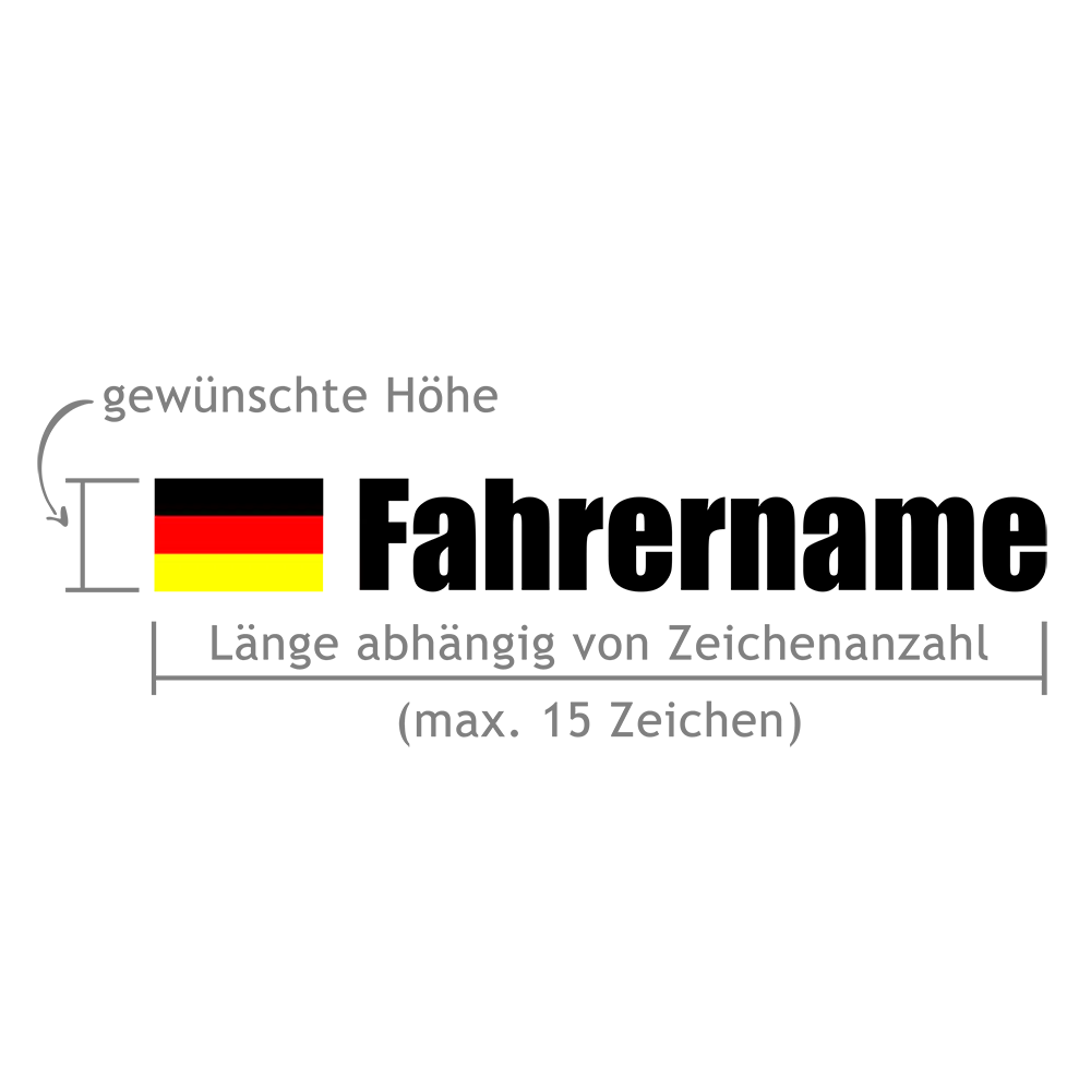 Neben der Standard-Ausfรผhrung erstellen wir auch maรgeschneiderte Fahrernamen-Designs โ z. B. mit spezieller Schriftart, besonderem Layout oder angepassten Proportionen.